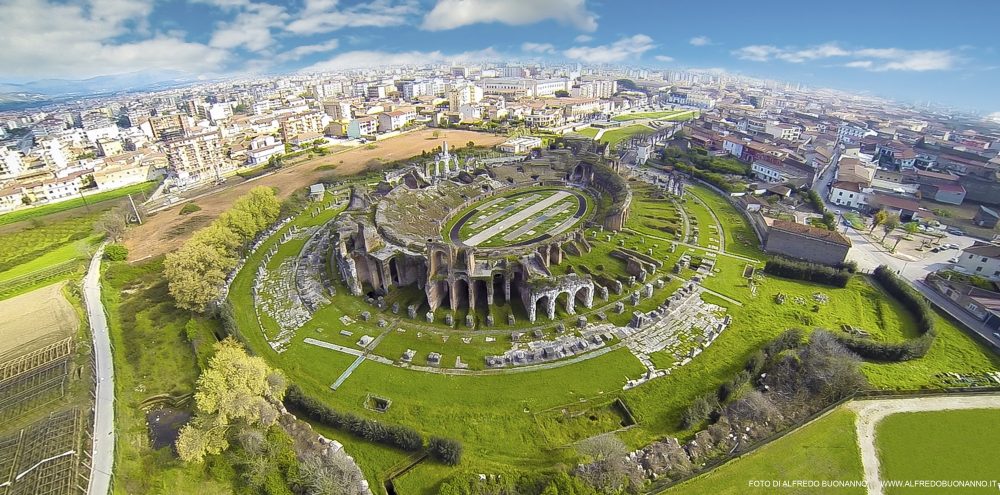 المدرج كامبانيان سانتا ماريا كابوا فيتيري, والثاني في الترتيب من حيث الحجم بين هذه الأنواع من الآثار في إيطاليا القديمة بعد الكولوسيوم (م. 165 على&[رسقوو]; المحور الرئيسي, م. 135 على واحد قاصر على مستوى&[رسقوو]; الساحة), أثيرت بين نهاية الأول وبداية القرن الثاني الميلادي لتحل محل&[رسقوو]; الساحة أقل رحيب التعارف العودة إلى وآخرون&جيرماندبلز;غراكانا, وقد تم التعرف على بقايا التي إلى الجنوب الشرقي.