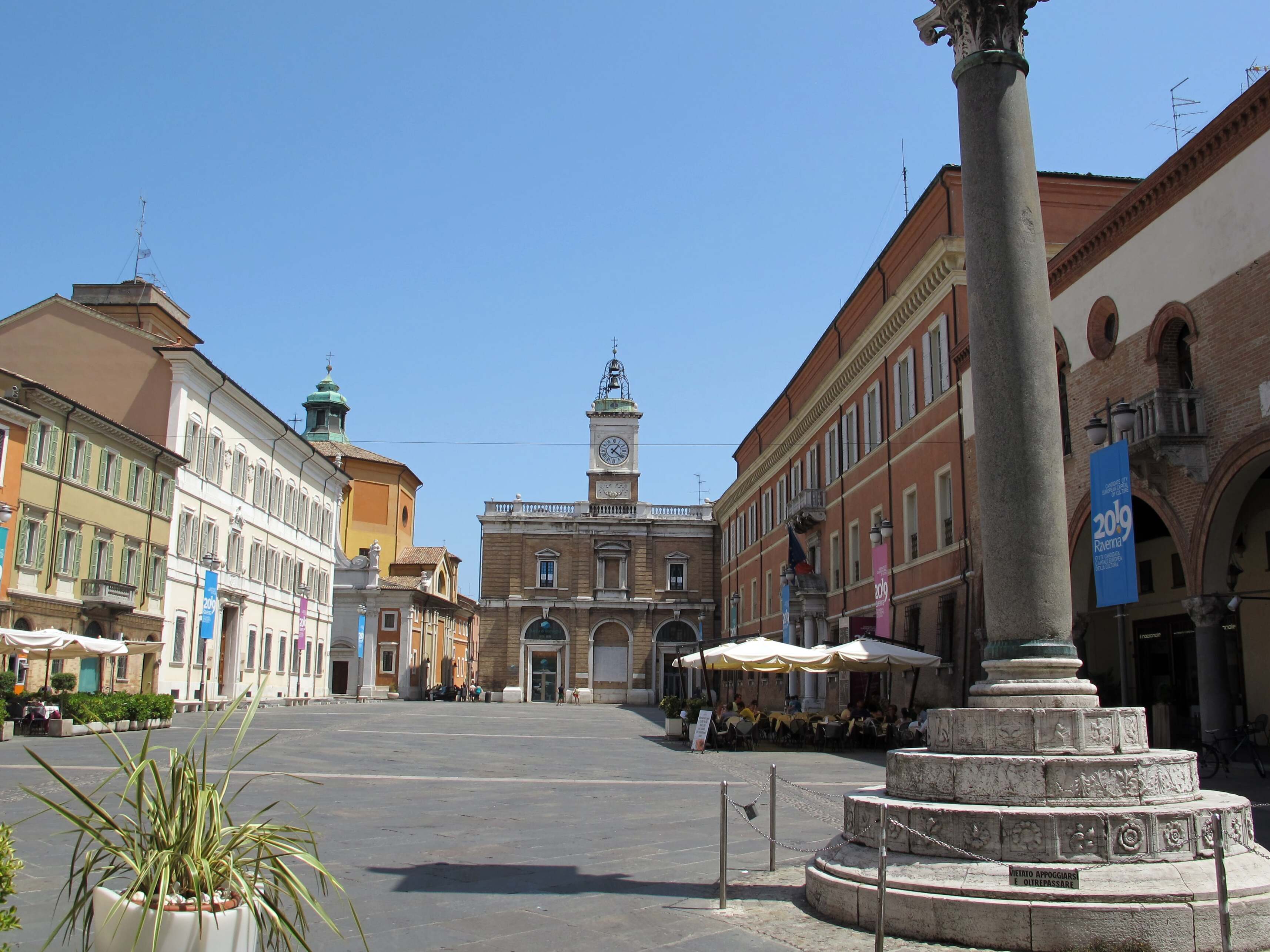 拉文纳市令人兴奋的卓越中心毫无疑问是着名的Piazza del Popolo广场:一个将历史中心的街道团结在一起的交汇点,并不罕见地欢迎事件和事件。 它是由威尼斯人在十五世纪下半叶建造的,在十五世纪(1470-80年)中,他们被定义为广场的大小,沿着帕德纳海峡(padenna)的河岸扩展了一个简单的空地,该空地位于现在的梅拉托宫(palazzo merlato),但此后的大小保持不变。 1483年,两根花岗岩柱子被竖起来,将广场划向Padenna的路线。 在两者中的一个之上放置了圣马克的狮子;在另一个之上,守护神Apollinare的雕像。 到1509年,教皇朱利叶斯二世通过在沙砾中击败威尼斯人占领了这座城市,Serenissima的徽章从广场上消失了:柱子上的狮子被Sant'apollinare所取代,并在他身边放置了圣维 两根柱子都位于圆形底座上,饰有花卉图案和黄道十二宫标志。 为了构建我们发现的广场:crenellated宫殿,它位于两根柱子附近,这座柱子建于十四世纪,DA Polenta家族的住所曾经在那里。 在广场的南侧,我们发现罗马涅校长的宫殿建于1295年,后来成为使徒宫殿和罗马涅使节的所在地。 在piazza del Popolo广场还有国家劳工银行的前总部,由建筑师Camillo Morigia建造,通过一个voltone与县宫相连,从中可以看到但丁的坟墓。 沿着广场的周边还有Palazzo Dei Rasponi del Sale,这是一家银行的当前所在地。 在十五世纪后期,威尼斯圣鲁菲略教堂(后来的圣塞瓦斯蒂安诺)的正面结合了公共机械钟的表盘。 这座建筑的两侧是第二座供奉圣马克的教堂,它们一起形成了一个单一的建筑群,上面有一座钟楼。