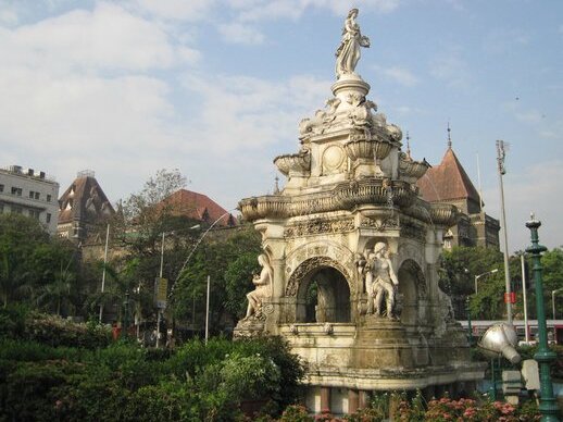 弗洛拉喷泉是由1864年统治孟买的英国殖民政府建造的。 它最初以孟买总督Bartle Frere爵士的名字命名,他负责建造现代孟买。 但在就职典礼之前,"Flora"这个名字被赋予了它-罗马的生育,鲜花和春天女神。 它是由印度西部的农业园艺协会于1864年在一位富有的帕西商人Cursetjee Fardoonjee Parekh捐赠的帮助下建造的。 喷泉的起源在于拆除堡垒墙壁。 堡垒有三个门–集市门,阿波罗门和教堂门-在拆除之前,Flora喷泉安装在同一地点。 它矗立在另一座纪念碑旁边,一座石头雕像,上面有一对手持爱国者的火把,纪念为独立的马哈拉施特拉邦而战的Samyuktha Samiti士兵,称为烈士广场或胡塔特马集市。 喷泉由Richard Norman Shaw设计,由James Forsythe雕刻,灵感来自新哥特式和印度撒拉逊式建筑风格。 植物的结构矗立在喷泉的32英尺高的基础上,植物在顶部是7英尺。 它是由波特兰石雕刻而成,并涂上一层白色油漆。 原来的石灰石是一个发光的淡米色。
