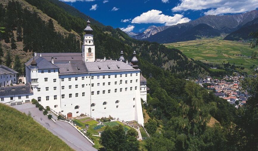 Die Abtei Monte Maria ist die höchstgelegene Benediktinerabtei in Europa. Die Abtei der Grafen von Tarasp wurde um 1200 erbaut. Die Barockkirche ist die einzige dreischiffige Basilika im Vinschgau. Das romanische Muschelportal aus dem 12. Jahrhundert ist unverändert geblieben. Bemerkenswert sind auch die gotische farbige Gipsplastik der Maria mit dem Kinde und das Fresko neben dem Portal von H. J. Pfeil aus dem Jahre 1650, das den Gründer Ulrich von Tarasp und Leopold von Österreich mit ihren Wappen darstellt.