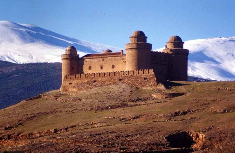 ### Arte e architettura Il Castello di Calahorra è un esempio pregevole di architettura rinascimentale. Le quattro torrette angolari, sormontate da delicati cupole, si ergono maestose, mentre la pietra locale conferisce al castello un aspetto robusto e imponente. L'interno è adornato con affreschi che raccontano storie di battaglie e leggende locali, sebbene l'accesso sia limitato al mercoledì mattina. La vista panoramica dalla sommità del castello offre un quadro mozzafiato delle Montagne della Sierra Nevada, che si stagliano sullo sfondo, creando un contrasto spettacolare con il blu del cielo.
