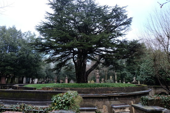 i hjärtat av västra sidan av Highgate Cemetery är cirkeln av Libanon. Denna runda mausoleer skapar en massiv kruka, som innehåller en gammal cederträ i Libanon. Världens största krukväxt.
