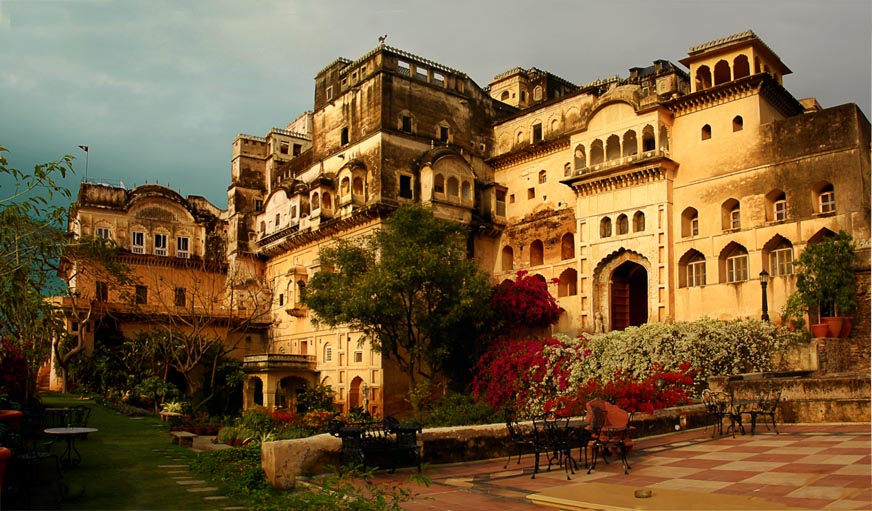 O Riverside Palace foi construído em 1875 por Maharajah Bhagwat Sinhji para seu filho Yuvraj Bhojraji, que é preparado ser gramados e jardins, e tem maravilhosamente nomeado arranjo sentado — a "sala de estar" é decorado em estilo colonial típico com lustre, mobiliário antigo de madeira e sofás; considerando que o "quarto indiano" decorado com beadwork, brassware e pinturas, tornou-se agora um hotel património. Detalhe do Palácio Naulakha Gondal, 1909