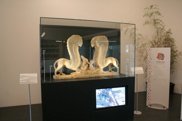 Grifonii din Ascoli Satriano, minunate marmure policrome datate între 325-300 î.Hr. care împodobeau un mormânt daunian, împreună cu un mare bazin care încă mai prezintă Nereidele pictate, înfășurate în mantii violete, purtând pe Ahile pe caii marini darul mamei sale Thetis, o armură impenetrabilă. La sud-vest de Foggia, Ascoli Satriano a fost un centru preroman; aici Pyrrhus a avut victoria sa proverbială și efemeră. Oferă diverse mărturii ale perioadei daune, inclusiv parcul arheologic recent excavat în zona Faragola.Grifonii, așadar. Acesta este un Trapezophoros, un suport de grindă decorat cu o pereche de grifoni care macină un cerb,