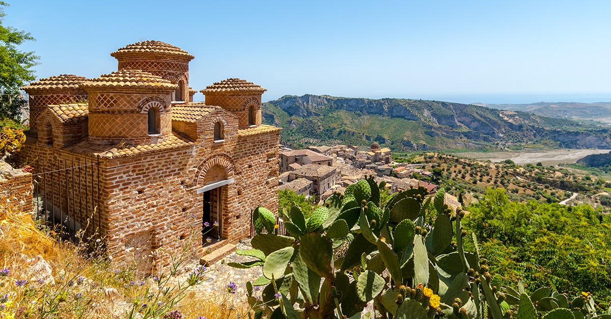 Počiva na obroncima Monte Consolino; pročelja crkve, manje-više kvadratnog oblika sa stranicama dužine oko sedam metara, obložene su trakama od crvene glinene opeke, koje su na spojevima obložene malterom. Lijevo od ulaznih vrata, a desno na kraju prednjeg zida, vidi se udubljenje, lijevo kako je pronađeno već 1914. godine, vjerovatno grobnica, s obzirom na to da je Vječni vikar koji je držao Cattolica, zahtijevao je jus sepulturae u navedenoj Crkvi, ali, podsjećamo, i na cijeloj teritoriji koja je pod kraljevskom imovinom i stoga je dio universitas.Crkvom dominira pet cilindričnih kupola prekrivenih pločicama poređanim u romb, a u sredini izlomljenim sličnim opekama, postavljenim u obliku "pilastog" uzorka, koje omogućavaju da se razbije hladnoća donje kubične mase. Krov i kupole pokriveni su crvenkasto žutim crijepom, a treba napomenuti da su kupole nekada bile pokrivene olovnim limom. Nestale su i mermerne stepenice na ulaznim vratima, dobijene od ostataka klasičnih stupova ili onih istog doba kao i crkva.U svakoj od dvije prednje kupole, postavljene nešto niže od stražnjih, nalaze se po dva mala jednostruka prozora; sa zadnje strane se otvara samo jedan. Središnja kupola, većeg prečnika i više od obodnih, ima četiri manja prozora sa dva otvora (prozora od muliona) podeljena grubim stubovima. Desno od crkve, za one koji ulaze, apside, koje se oslanjaju na kamenu zidnu podlogu; na lijevoj strani, dobro definisan zid, skoro da štiti hram. Ulazna vrata nadvišena su drvenim arhitravom koji se oslanja na dovratnike istih. Iznad arhitrava okrugli luk uokviren udubljenjima od terakote. Natpis urezan grčkim slovima pojavljuje se direktno na cigli lijevog dovratnika (možda ime nekog od graditelja ili naznaka indikacije). Unutra, od crvenog glinenog kvadratnog poda, uzdižu se četiri stupa, dva u cipollinu, jedan u Luni i jedan od granita, koji podupiru svodove stropa; podijeliti unutrašnjost na devet jednakih kvadrata, isključujući udubljenje tri apside.Na osovini prvog stuba sa desne strane uklesan je krst, okružen natpisom na grčkom koji u prevodu glasi: „Bog nam se Gospod javio“, stih preuzet iz psalma koji slavi Bogojavljenje ili ukazanje. Preostala tri stupca različitog su oblika: prvi lijevo (na čijem se vratilu nalaze uklesani tragovi natpisa arapskim slovima) počiva na prevrnutom korintskom kapitelu, a drugi na dorskom kapitelu. Smatra se da ova četiri stupa potiču iz različitih antičkih spomenika koji su nekada postojali na teritoriji Kaulonita, a u današnji dom, prema zanimljivoj legendi, donijele su "četiri mlade mještanke, koje su se tokom strmog uspona na planinu tiho vrtjele, pjevajući , gotovo ne shvaćajući njihov veoma ozbiljan teret”. Od tri apside (proteza, bema i đakonikon), smještene istočno od crkve, središnja je dobila mali oltar. Nasuprot ulaznih vrata, na sjevernom zidu, nalazi se veliki otvor, možda i ovo drevna grobnica ili vjerovatnije drevni pristup monaha koji su živjeli u pustinjačkim pećinama koje postoje na cijelom grebenu planine, iza crkve. . Od izuzetne vrijednosti su freske koje Cattolica čuva. Naravno, to je bio Paolo Orsi, arheolog iz Trentina, kada je nakon svojih stručnih terenskih istraživanja izjavio da je „crkva prvobitno bila prekrivena opštim malterom sa djelomičnim ukrasom, ograničenim na apside, velikim slikama svetaca; ali nije imala ogromnu složenu i organsku dekoraciju, već je prvobitno bila ograničena na nekoliko ploča, kojima su druge dodane kasnije.Više od pola veka nakon ovih zaključaka, koji potvrđuju valjanost onoga što je rekao poznati arheolog, odlična restauracija završena 1981. godine urodila je plodom na polju otkrića, osim pet slojeva fresaka postavljeno je na zidove. hram, karakterističan za različite epohe, ali koji svi pokazuju visoku umjetničku vrijednost.Zapadni zid prikazuje sliku Bogorodice koja sjedi na prijestolju i umotana u veliki plavi ogrtač ukrašen ljiljanima. Dalje lijevo od ovoga je graciozan lik Anđela Blagovijesti, djelomično rekonstruisana freska u dijelu lica i krila. Ikona koja prikazuje „Dormitio Virginis“ iz 14. ili 15. vijeka je u potpunosti osvijetljena, a koja se nalazi u sredini istog zida. Ali upravo su na apsidama sačuvane najbolje freske. Na stupu zida središnje apside prikazan je svetac, možda sv. Nikola; na lijevoj strani iste apside nalazi se stroga slika Sv. a ovdje, na desnoj strani, je najbogatiji lik u cijelom hramu: Sveti Jovan Zlatousti. Zadivljenog pogleda, vrat mu je okružen kadrilskim šalom sa velikim crnim krstovima i prekriven je dugim bijelim mantilom. Sugestivna figura sv. Ivana Preteče krasi apsidu Mezzogiorna. Umotan u veliku mantiju, u lijevoj ruci drži knjigu ukrašenu i pričvršćenu kopčama, dok desnom blagosilja. U sjevernoj apsidi prikazan je lik svetice, bijelog lica, sa čelom okruženim kraljevskom dijademom, umotane u crvenu tuniku prekrivenu bijelim plaštem.Na drugom dijelu gipsa nalazi se i freskopisan natpis u gotičkim likovima vjerovatno iz 1300. Konačno, u korespondenciji sa centralnom apsidom, iz bačvastog svoda pojavljuje se lik Krista, usred okruglih ornamenata sa likom apostola i opet između četiri serafima raširenih krila, koje blagosilja dok se uzdiže na nebo.