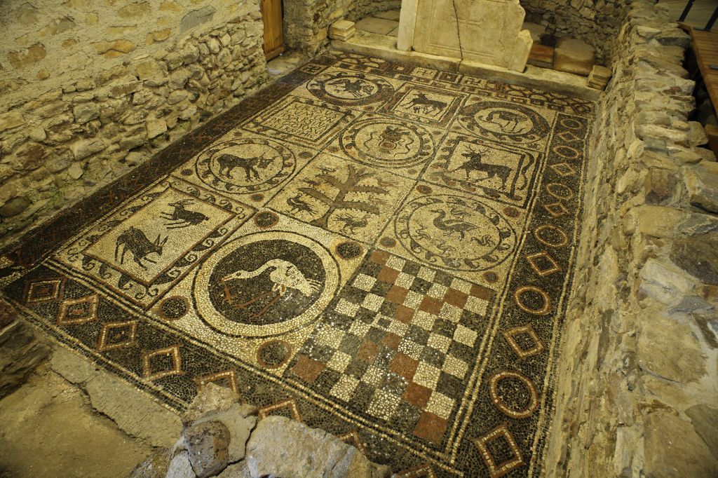 On en sait plus sur Teurnia à l'époque du Bas-Empire, lorsque la ville commença à prendre de l'importance. On sait par la Vita Sancti Severini d'Eugippe (v. 17 ; 21 ; 25) et par d'autres sources que Teurnia (alors appelée Tiburnia) était à cette époque un évêché. Au Ve siècle après J.-C., lorsque l'ancienne capitale provinciale Virunum commença à décliner, elle devint même la métropole de la province romaine restante de Noricum (mediterraneum). Elle a souffert des attaques croissantes des tribus germaniques (siège par les Goths vers 473) et a péri vers 590 après J.-C. lors des invasions des Slaves et des Awaris. Vers l'an 400, la colline a été fortifiée par des murs et des tours. Sous l'église Saint Pierre, à en juger par les maigres découvertes, se trouvait l'église de l'évêque, qui a été construite et détruite. Le cimetière paléochrétien est situé dans la plaine au pied nord-ouest de la colline où une église-cimetière, probablement du début du 5e siècle, a été découverte. En raison de la richesse exceptionnelle des découvertes, il s'agit de l'église paléochrétienne la plus intéressante de l'Austria Romana. Le plan est inhabituel, sans parallèle clair. Son état actuel est certainement le résultat de plusieurs périodes de construction. Le plan original comprenait une salle rectangulaire (environ 22,2 x 9,25 m) avec deux chapelles latérales absidales comprenant des antichambres. Les ajouts ultérieurs sont un narthex, deux couloirs latéraux et la sacristie de la chapelle latérale N. Les fondations et les fragments de pierre de l'édifice ont été conservés. Les fondations et les fragments de l'ameublement en pierre donnent une idée de l'intérieur. Le presbytère était délimité par des barrières décorées de reliefs. La banquette du clergé, non fixée, comportait une table de service à chaque extrémité. Le reliquaire était encastré dans le carré d'autel pavé et au-dessus de lui s'élevait la table d'autel à quatre pieds. De l'autre chapelle latérale, il ne reste que des reliefs en pierre fragmentés provenant de la barrière du presbytère. La chapelle latérale droite était mieux conservée. L'abside a été séparée et l'autel de la table à piédestaux reposait sur un reliquaire construit à partir d'un autel sépulcral romain du Ier ou IIe siècle après J.-C. La découverte la plus importante est une mosaïque de sol (6,10 x 4,25 m) dans la nef. Datant d'environ 500, c'est la dernière œuvre d'art de l'Austria Romana. Elle est en excellent état, contenant dans un cadre ornemental 12 champs, des représentations principalement d'animaux. Un champ est réservé à l'inscription des donateurs : le gouverneur Ursus, appelé vir spectabilis, et son épouse Ursina.