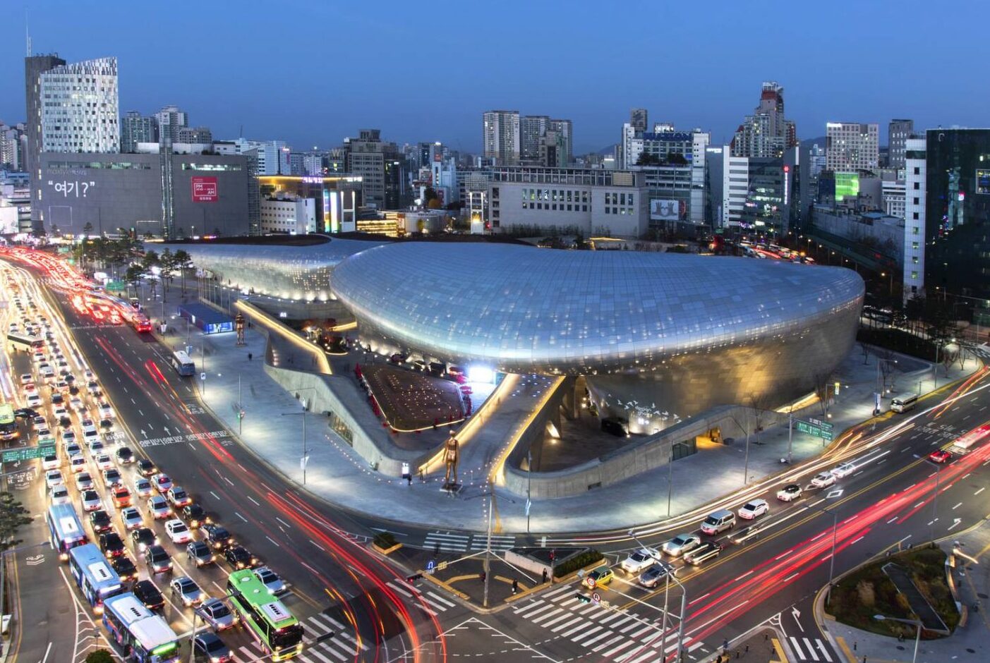 Dongdaemun Design Plaza (DDP) is a cultural and exhibition centre dedicated to design, technology and art, whose construction has involved the redevelopment of an entire block in the district of the same name in the city of Seoul. Designed by Zaha Hadid Architects, the new site is open to the inhabitants and visitors of Dongdaemun as an area of leisure and relaxation within the densely built-up urban context of the district. Designed in a typically neo-futuristic style, it is characterized by curved, smooth and elongated forms. The centre is composed of a square, a multi-purpose park built near the remains of the fortress walls that surrounded ancient Seoul, various clubs and shopping centres, exhibition spaces of various kinds and pedestrian areas. Aesthetically, it is distinguished by the construction of the façade with concrete covered with a mirrored-effect steel and aluminium surface. View of the "electronic rose" garden Inside, there is a garden consisting of 25,550 artificial "electronic roses and flowers" that are illuminated by LEDs. The DDP was one of the main reasons for Seoul's designation as World Design Capital in 2010. Construction began in 2009 and was officially opened on March 21, 2014. It is physically connected to the Seoul subway station. It won the SEGD Merit Award, 2015.